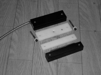 Step 2: 1) Drill holes for the switch and spacer which fits under the switch. 2) Fix the spacer to the stationary frame with a flat head screw ensuring that the small anti-tamper magnet is to the right as shown. 3) The spacer may be used as a template for the holes. 4) Sometimes, double sided adhesive tape can facilitate the assembly procedure, although it should be removed before fixing the spacer. |