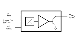 Step 8: 2) The existing high positive line should be connected to Vout (green). 3) Most security systems have 12V lines going to other devices. This 12V power line and ground can form part of this installation. The remaining existing switch ground line just determined and the 12V power ground line should be connected together with the switch Gnd (black). 4) The 12V power line should be connected to Vs (red). 5) The switch yellow wire is connected to Remote Test. Many systems have a remote test feature. A 12V pulse on this line will reset the switch and cycle it through the test sequence in Step 7 above. This is an optional step. Leaving this Remote Test line open will not affect the switch function or operation. |