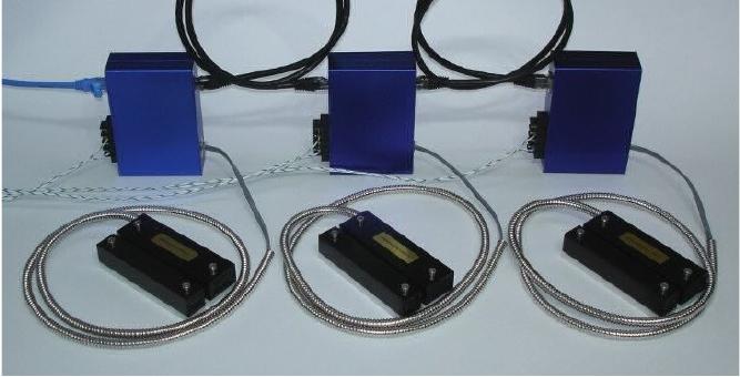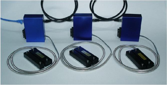 Three switches of the 3D Magnetometer network type connected as nodes on an RS485 network.